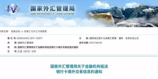 6月2日,外管局官方網(wǎng)站發(fā)布了《國(guó)家外匯管理局關(guān)于金融機(jī)構(gòu)報(bào)送銀行卡境外交易信息的通知》,通知寫道,為加強(qiáng)銀行卡境外交易監(jiān)測(cè)管理,維護(hù)銀行卡境外交易秩序,外管局決定開展銀行卡境外交易信息采集工作,自2017年9月1日起施行。