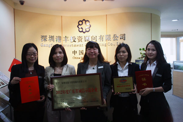 我司榮獲了“2012年廣東省誠信示范企業(yè)”榮譽稱號,成為行業(yè)內(nèi)首家獲此殊榮的企業(yè),港豐總經(jīng)理魏曉嶸和副總經(jīng)理葉惠霞授領(lǐng)榮譽牌匾和證書。