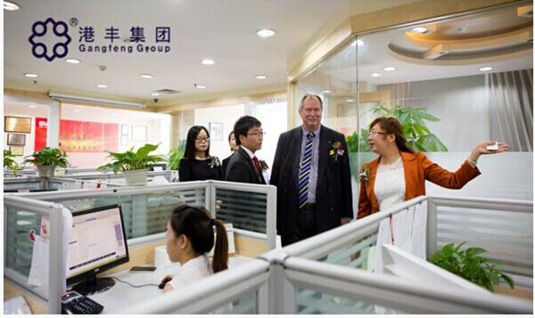 座談會后港豐集團CEO魏曉嶸帶領(lǐng)阿聯(lián)酋哈伊馬角政府投資局董事局總經(jīng)理Mr. Peter-Michael Shuster一行參觀了港豐集團深圳公司辦公區(qū)域。面對深圳港豐一流的辦公環(huán)境Mr. Peter-Michael Shuster感慨的說“我17年前就來過中國,今天的中國變化真是太大了,我喜歡中國,中國是一片充滿機會的熱土。也非常喜歡港豐,港豐是一個國際化品牌公司”
