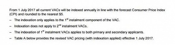 這意味著從今年7月1日起,所有的簽證費用將根據(jù)預測的消費者物價指數(shù)進行調(diào)整。簽證費每年都將按指數(shù)計算,并四舍五入至最接近的5澳元。這一指數(shù)化只適用于第一和第二申請人簽證費的首期付款,不適用于簽證費的第二期付款。